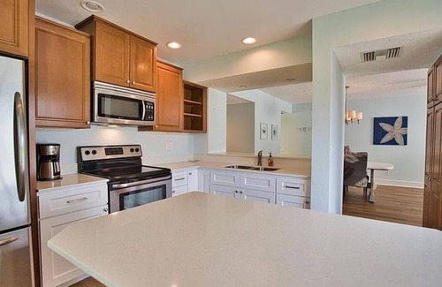 The roomy kitchen has granite counter tops and stainless appliances with a breakfast bar overlooking the great room for dining and living. Outdoor spaces abound. Through the living room sliders is a lanai with perfect views of the 3rd hole tee box. Perfect for enjoying morning coffee. Off the kitchen is a screened lanai featuring views of the golf course with al fresco dining for 6. Each of the three bedrooms have private access to an outdoor area. The master and 2nd bedroom open to the courtyard with overhead pergola. The 3rd bedroom opens to the lanai. Spacious master bedroom features a King Size bed with en suite bathroom. Master bath features wet and dry areas with separate sinks. Each of the completely separate bedrooms feature Queen beds. Completely furnished and relaxing nautical decor. Private washer and dryer. Enjoy the activities at either of the community pool or leisurely walks in the beautiful neighborhood with mature landscaping. A short drive to beaches, historic downtown, parks, shopping, restaurants, theater, museums, and the Atlanta Braves Spring Training Facility is less than 5 miles. Non-Smokers.