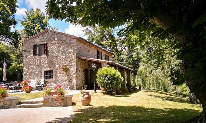 Ancient Tuscan nineteenth-century stone farmhouse with private pool, for the exclusive use of guests, immersed in a fenced park of one hectare with chestnut trees, beech trees and fruit trees.