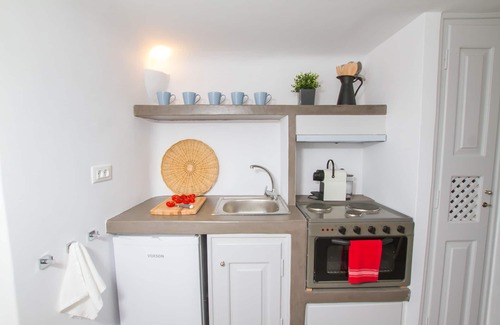 The cave house consists of two adjacent rooms, each one with its own entrance, but also with an interconnecting door. The first room features a double bed, a basic kitchenette and an en-suite bathroom. The second room is more spacious and offers a fully equipped kitchen, a dining/living area and an en-suite bathroom . The room also features an open loft with a double bed. Furthermore, the couch can be prepared as a single bed in order to sleep a fifth guest. Both rooms' doors lead onto the house's idyllic terrace that overlooks the endless blue of the dazzling caldera. Twin Cave House can comfortably host two couples, while offering them privacy, but is also ideal for families, or groups of friends.