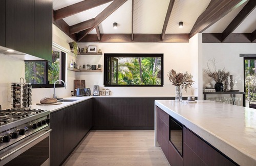 The entry opens to the substantial open plan kitchen, dining and living area with soaring timberland ceilings towering over the space, custom furniture by Two Acres Furniture, a large open wood fireplace and Spanish plastered walls. As you stroll out onto the spacious undercover timber deck, the landscaped tropical gardens, rainforest and infinity pool create an unforgettable first impression.