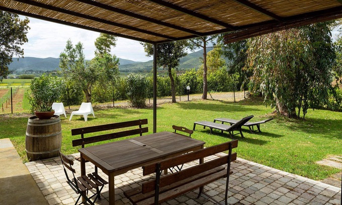 This bright two-bedroom apartment with mezzanine is surrounded by a large garden with private patio equipped with table, chairs, sun loungers and barbecue. The rooms are tastefully furnished and complete with all comforts such as air conditioning, heating, free Wi-Fi, LCD TV, kitchen with oven, refrigerator with separate freezer compartment, utensils and crockery, table and chairs. The bathroom has a shower cubicle, bidet and hair dryer. The first double bedroom is located on the ground floor, while the second is on a mezzanine level and can be easily reached from a staircase in the living area.