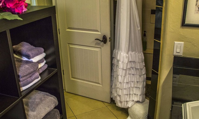 has a complete fully stocked kitchen with a side by side frige, gas range, microwave, dishwasher. It is furnished with all the pots and pans and kitchen utensils and appliances you will need. There is on site parking.. Blackout curtains are just perfect for a good night’s sleep.Your pets are welcome if