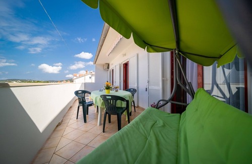 Apartment can accommodate 6 guests. Beds are situated in 2 sleeping rooms, but also in the living room, within 70m2. Guests can use a private terrace to enjoy the warm summer evenings. The apartment offers the sea view. Food can be prepared using barbecue which is shared with other guests too. This accommodation unit welcomes pets at an additional charge.