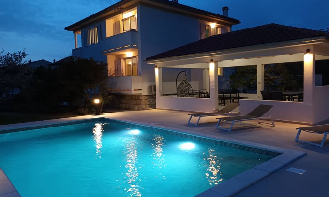 Infield (Well-kept), Courtyard (120m2, Area suitable for children, Sitting area), Parking lot (Number of parking spaces: 2, Distance from the house: In the courtyard), Pool: shared, Dimensions: 8m x 4.5m x 1.5m, Type of water: Freshwater, Barbecue: shared, WiFi Internet, Hairdryer, Iron, Ironing board