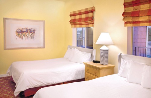 This spacious two-bedroom resort suite measures approximately 1,253 square feet. You will enjoy a king bed in the master bedroom, two queen beds in the guest room and a queen sleeper sofa in the living room. Additional amenities include two full bathrooms, whirlpool tub, full kitchen and dining area, washer/dryer and spacious balcony. Sleeps eight.