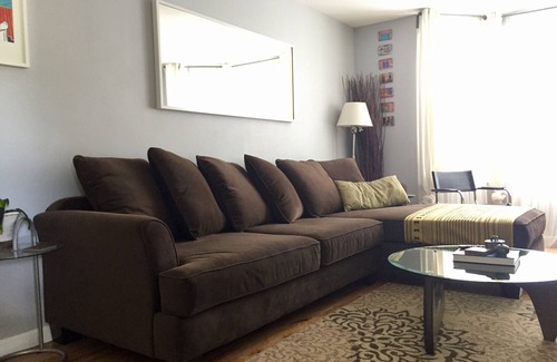 Fully-renovated duplex apartment with new kitchen and appliances; modern, cozy furniture and art throughout. The entrance to the apartment is on the second floor after an easy flight of stairs from the main foyer. The main common spaces -- kitchen, living room, and dinning area -- are on this floor as well as 3 bedrooms and 2 full bathrooms and it sleeps up to 10 people exclusively in the bedrooms. (This floor could potentially be rented separate from the ground floor space for smaller groups).