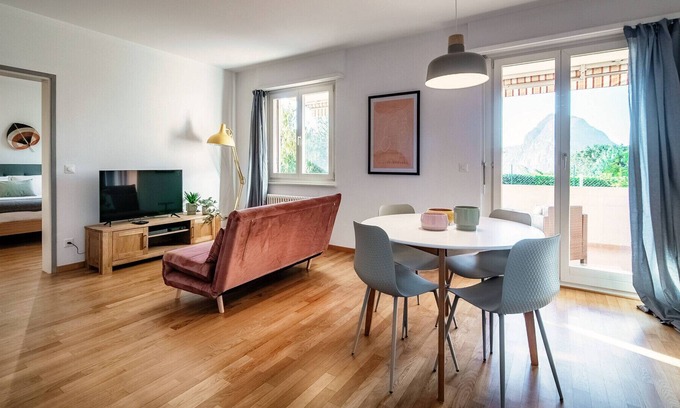 The beautiful landscape of Lake Lugano and the surrounding green mountains will be your daily view from BREZZA DI LAGO, a cosy one-bedroom apartment in an elegant building in the panoramic area of Ruvigliana, above Lugano. The flat has a bright living room, consisting of the TV area, with a sofa that becomes a comfortable double bed for the night (Please note: the sofa bed is not prepared, we think it is proper to use the sofa during non-sleeping hours. You will find sheets, pillows and blankets in the closet/shelf most adjacent to the sofa.), and the dining area with a table for 4 where you can have lunch and dinner with your family.