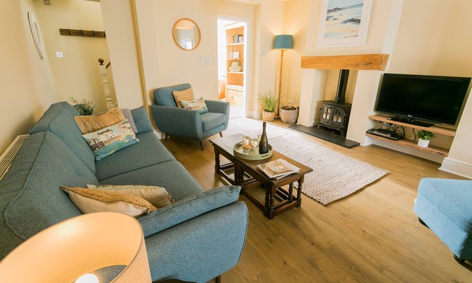 Step into Ty Medi and it has a cosy sitting room with a wood-fired stove. Through to the sociable kitchen and dining area, perfectly set up for cooking and leisurely dining. Throw open the french windows and step out onto the terraced verdant rear garden. Over the stone wall at the end of the garden is the 14th century Church of St Mary's and St Nicholas. You'll hear pealing from the bells from time to time, adding to the holiday vibe.