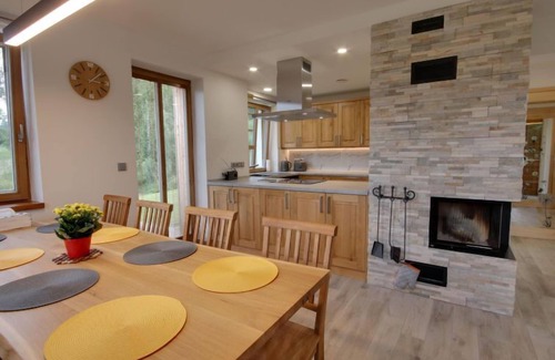 "U Krále", 4-room apartment on 2 levels. Object suitable for 8 adults + 1 child. Beautiful and modern furnishings: living/dining room with Scandinavian wood stove, dining table and TV. Exit to the terrace. 1 room with 1 double bed. Kitchenette (oven, dishwasher, 4 ceramic glass hob hotplates, toaster, kettle, microwave, freezer, electric coffee machine). Shower, sep. WC. Upper floor: 1 room with 4 beds. 1 room with 2 beds. Shower/WC. Facilities: baby cot. Internet (WiFi). Suitable for families.