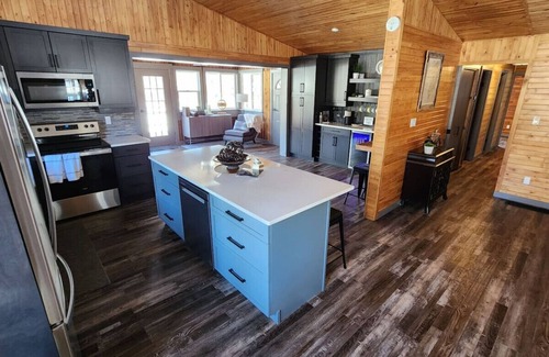 1800+ sq ft vacation rental nestled in beautiful Spruce Sands, 12 min north of Gimli and 1 hr from Winnipeg's north perimeter. LBGTQ2S+ and Pet Friendly. Rustic finished lodge has deluxe amenities, open concept, coffee/wine bar and 72inch 3 sided fireplace, perfect for entertaining! High speed internet, big front yard with a wrestling ring. Take the fun outside, front and back decks, bonfires and BBQs in a fully treed yard and seasonal bunkie with vintage bubble hockey table and dart board.