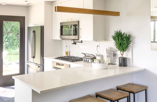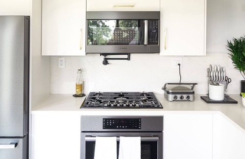 This dream kitchen is designed to be highly functional for the master chef, yet is also sleek and easy to use for the not so culinary inclined. All modern Bosch appliances are present: dishwasher, full-size oven, five burner gas range, microwave/convection oven, and full-size French door fridge. The Black stainless steel compliments the white base tones of the quartz countertop and European cabinets. Gold accents, soft close everything and ample storage make this space a dream to work and chill in.