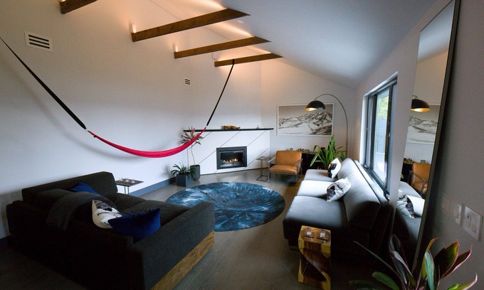 An 18-foot tall cathedral style lofted ceiling gives this open-format room an immense yet cozy vibe. The room is adorned with sleek designer furnishings and lounging features including two abundant couches, a leather sitting chair, and a crimson red hammock. The custom white architectural facade fireplace provides the focal point of the room, while the concealed dimmable and color changing lighting lets you set just the right mood. There is also a 3rd bed in the form of a couch pull out for shorter term stays of a 5th guest.