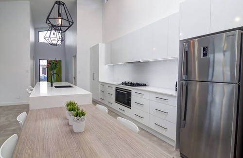 - Designer tapware, and stone benchtops with cleverly designed floating dining table