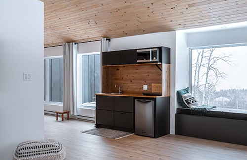 Each accommodation is located upstairs and has its own large terrace to enjoy the surroundings. The view overlooks Mont-Sainte-Anne, which will dazzle you with its lights in winter. You can see the St. Lawrence River all the way to Quebec City, which lights up in the evening.