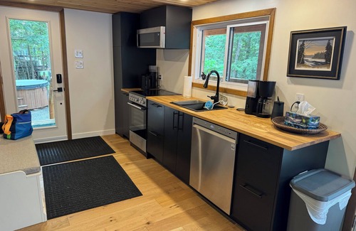 Living and dining areas are open concept with cathedral ceilings, black accent panelling, Muskoka granite feature wall behind high efficiency wood stove. Fully functional new kitchen with a dishwasher, microwave hood, coffee maker and coffee bean grinder. There are 3 bedrooms and 2 bathrooms with showers.