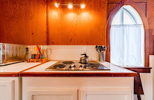 Well-stocked kitchenette with a small fridge, four-burner electric cooktop, microwave, convection oven, toaster, and dishwasher. Streaming TV services require guest accounts to access. Feel free to enjoy the veggies from the garden in the backyard when they are in season. Weather and carrier services can affect internet signals. A personal hotspot is recommended. The home is conveniently located off HWY 101, and the interior is well insulated, making the home feel like a sanctuary among the majestic Redwood Valley farms and ranches nearby. There is also a rooster on the property that crows in the morning.