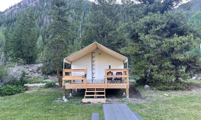 This tent features a front porch with two chairs, a gas grill, and a picnic table. Additionally, there's a fire pit in front of the deck for a cozy and intimate experience during your stay.