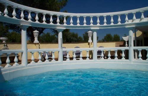 "Villa Romantique" is a stunning and very spacious stone-built villa with a magnificent Roman arena-style colonnaded circular swimming pool, superbly located on a hilltop, giving you the most wonderful panoramic views. It basks in the sunshine and the very special light of this Provence/Languedoc region.