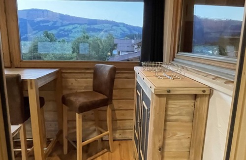 This unique apartment can accommodate four people with a fantastic view of the ski slope and the great mountain scenery of the Kitzbühel Alps.