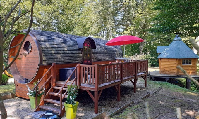 Le Tonneau (2 people): a cozy cocoon with a double bed, kitchenette, bathroom, and large terrace with barbecue.
