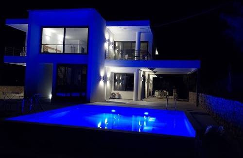 Sea front villa with two floors and swimming pool. The Villa is designed by famous architects and is a very modern loft type villa. It has two bedrooms, 1 big fully equipped kitchen, 1 bathroom and a living room with dining table. The villa has amazing sea and mountain view. There is private outdoor space in front the pool with sea view and outdoor furniture. There is a barbeque place in the backyard with tables where you can enjoy the sitting under olive trees.