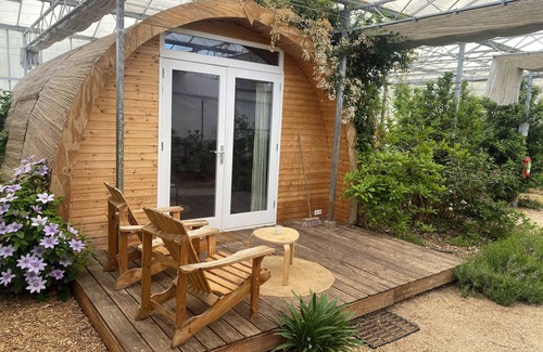 This is our "Tiny House" with a spacious private courtyard and lovely Hot-tub. It is in a peaceful, relaxed and green environment. There is a double bed, beautiful bathroom with floor heating, dining table and a kitchenette with oven, a stove, kettle and coffee machine (Nespresso).