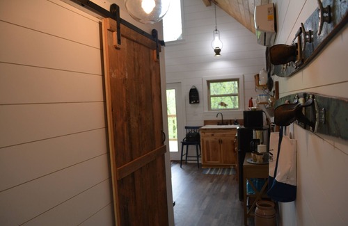 The treehouse is designed and decorated to help you relax. It features a bedroom with a king bed as well as a loft with a queen bed and two twin beds. The full bath has plush towels with soap and shampoo provided. The kitchen is fully stocked with dishes and utensils. It has a microwave, drip coffee maker, refrigerator/freezer with ice maker, griddle, convection toaster oven with air fryer and hot plates. A charcoal grill and picnic area is just outside. The tall vaulted ceiling and shiplap walls help create a light and airy feel.