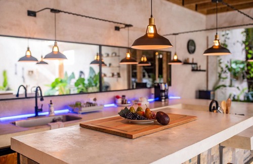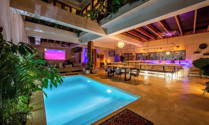 Enter through a tropical garden with palm trees, climbing plants, and hand-picked vibrant floral arrangments that display a tranquil environment setting the tone for an unforgettable stay @Casa Bonita. All Bedrooms at this Villa have large spaces, private full-size bathrooms, his and her sinks, and quality bathroom fixtures providing multiple showering options after a long day in the sun. All Villa bedrooms are located on the second and third levels. The open aired ground-floor common room has an oversized feeling from large floor-to-ceiling spaces with many unique and comfortable places to kick up your feet, sit, read, cook or simply rest. At night, let the multi-colored ambient lighting create a space to reflect a great mood. Play games at the oversized sit-down table and plan a dip in the heated pool after dinner. If you are lucky enough, allow mother nature to amaze you with a periodic tropical rain shower dropping indoors on the large leaf plantings and in the pool. A great space perfect for sharing remarkable moments together. In the kitchen, you are free to comfortably cook on the open-concept floating kitchen island equipped with all the necessary amenities for that special meal.