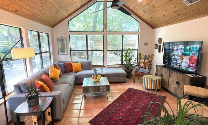 Beautifully designed: original artwork, stylish re-claimed furnishings, Saltillo tile, tongue-and-groove wood ceilings, wrap-around sunlit windows looking onto a 3 tier deck anchored by a majestic oak with a private wooded backyard.