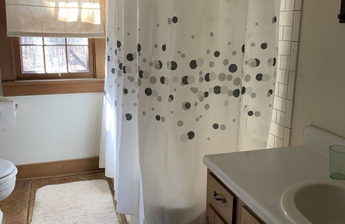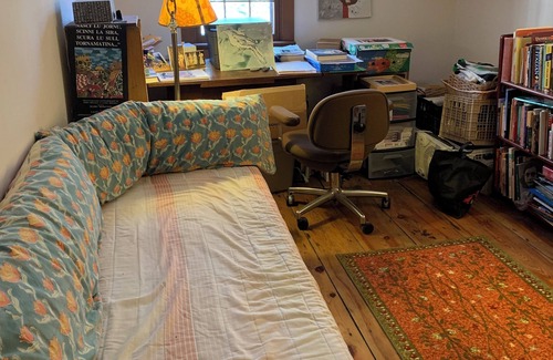 Home has beautiful comfortable feel with wide-board pine floors, chestnut beams, bluestone foundation. Warming fireplaces in kitchen-dining room and living room. Two upstairs bedrooms with Queen size beds. Living room futon and sofa-bed serve as couches by day, beds by night. Upright piano to play. One full bath, one 1/2 bath. Covered back screened porch looks out onto field, woods, pond. Patio and garden. 10 1/2 acres on property. Deer, wild turkey, hawks, the seasonal bear. Nearby walks on quiet country road to creek, stone cliffs, waterfall, beaver lake. Amenities include wi-fi & internet; washer and dryer; outdoor clothesline; filtered well water; parking space on property. Fifteen minutes to nearby towns and interstate highway; nearby tennis, golf; half hour to ski resorts. Fall golden maple leaves, walks and hikes; Winter snow, skiing, sledding; Spring garden, herbs and flowers; Summer sun, nearby lakes and rock-pool swimming.