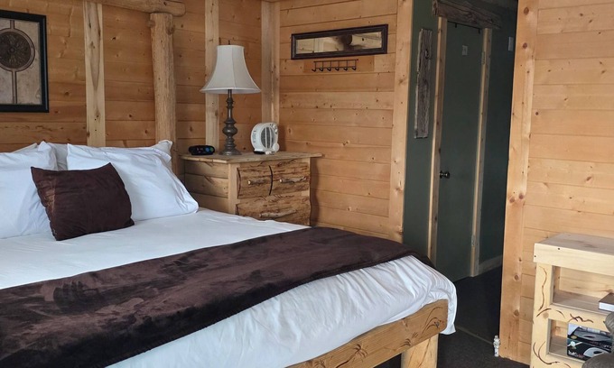 Step into rustic elegance with this beautifully appointed studio featuring classic Colorado Aspen woodwork throughout. The centerpiece is a California king bed topped with a 2.5" memory foam mattress and a handcrafted log headboard, perfect for a restful night after exploring the Grand Mesa.