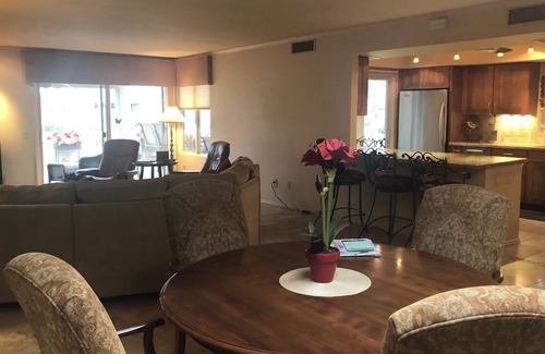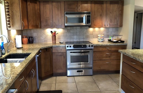 This is a remodeled 1558 sq ft town-home with a prime location on the golf course and views of the clubhouse and fountain! Our town house offers an open floor plan with travertine flooring in the main living area, a dry bar with wine fridge, master bedroom with a sleep number king bed and en-suite, the second bedroom has a queen murphy bed. The fully-equipped open kitchen includes granite countertops, stainless steel appliances and walks out to the Cottonwood golf course tenth tee box. The perfect location as our home is walking distance to the clubhouse and the new fitness center.
