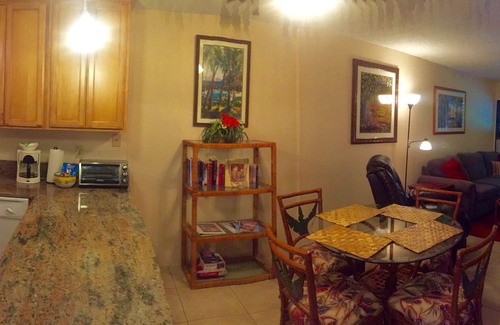 This ground floor 2 bedroom, 2 full bathrooms is a great value! Recently renovated kitchen and bathrooms with new cabinets, granite counters, walk in shower in Master, tile flooring throughout. New furniture master bedroom, new mattresses in both bedrooms, 2 lanais: off the living room and bedroom. Stay in and enjoy your own prepared meals in the efficient and fully stocked kitchen kitchen or you can take a short 2 minute walk and be served at the many restaurants that are right down the street!