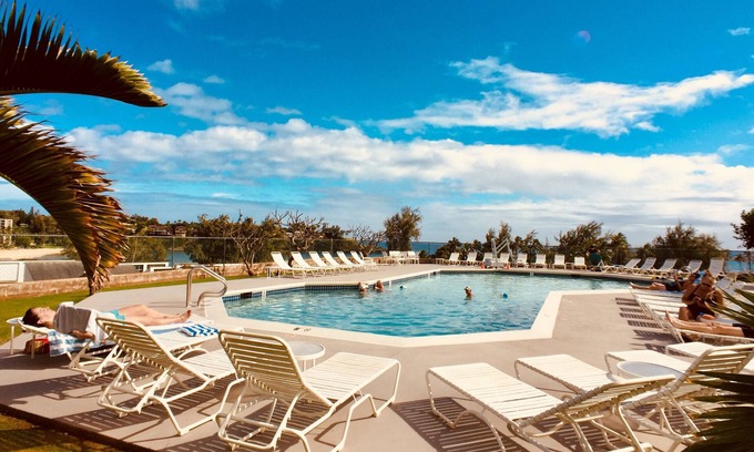 Heated salt water swimming pool with ocean view, tennis/pickleball court, shuffleboard, BBQ pavilion, and activities desk.