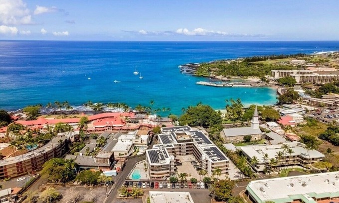 Beautiful condo just steps from shops, restaurants, Kona Pier and a sandy beach with calm waters that is perfect for swimming, snorkeling and relaxing. Roof top deck overlooks the starting line for Ironman, has impressive views of the bay and is the perfect location to view for local parades.