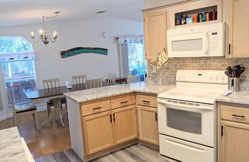 Enjoy the water views from the screen porch or sit in the Adirondack chairs out on the dock (where you can also tie your boat). Paddle the crystal clear Weeki Wachee river in one of the 4 kayaks (one tandem, three singles) or canoe or paddle board - just a 5 minute paddle from the house. Swim off the dock in the canal or in the main river. We have a water mat you can lounge on off the dock. Excellent manatee, turtle, large water bird, and flying mullet viewing from the house. Large, open concept living room/dining area, well appointed kitchen, updated master bathroom. Fire pit overlooking water. Bike the quiet Weeki Wachee Gardens neighborhood on the 2 bikes provided. Great restaurants and breweries nearby. 10 minute drive to see the mermaids at Weeki Wachee Springs State Park and Buccaneer Bay Water Park. Easy day trip to Homosassa Springs State Park and Crystal River, or head south to Tampa/St. Petersburg. Or - never leave the tranquility of the house and our quiet canal!