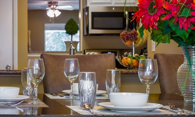 The living room has a comfortable leather sofa and love seat and a 55" smart TV where you can stream your own Netflix or other favorite streaming service (no cable). Each of the bedroom also have smart TVs for streaming. The kitchen features stainless steel appliances, granite countertops and is fully equipped with a drip coffee pot, blender, toaster, pots, pans, plates and silverware for 8 people.