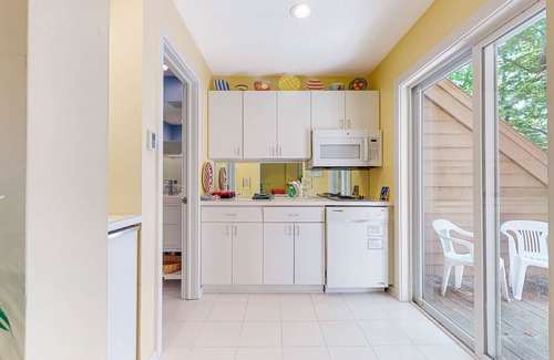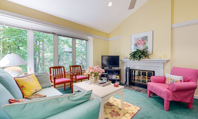 The bright, airy, and cheery living room awaits with a fireplace, comfortable sofas, a dining table, and a TV with cable. The well-appointed galley-style kitchenette is complete with a two-burner stove, an under-counter mini-fridge, microwave, toaster, and dishwasher. This lovely kitchenette opens up to a furnished deck overlooking the forest. The bedroom offers a comfortable bed and the bathroom available features an updated sink, fixtures, and shower, along with a soaking tub.
