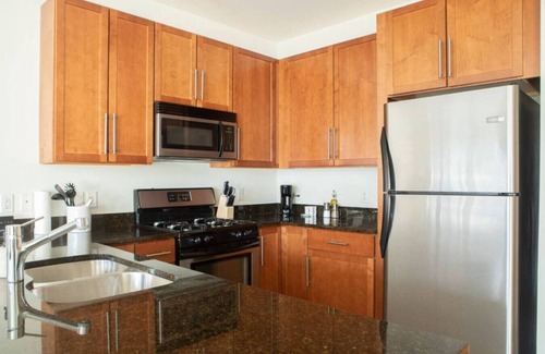 24-hour fitness center, community kitchen and lounge, community outdoor deck with grills, smart TV, self check-in, high-speed Wifi, laptop-friendly workspace/dining table (when Murphy bed is not in use), additional desk nook next to Murphy bed, private balcony, and in-unit laundry