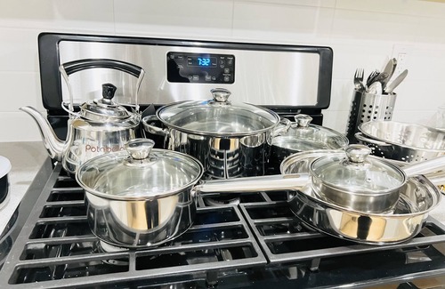 Spacious living room featuring a 55” smart TV, flowing into the open chef's kitchen with an island and seating for up to four guests.Modern kitchen equipped with granite countertops, stainless steel appliances, pots and pans, Keurig coffee maker, toaster, and blender.