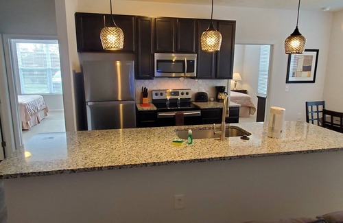 Nestled in Columbus, this delightful apartment offers 2 bedrooms with 2 queen beds, perfect for a peaceful getaway. With amenities like WiFi, AC, and a washing machine, guests can relax and unwind in this amazing space. Our place is equipped for both long or short stays to make your holiday one to remember. Each bedroom has a queen bed with Smart TV + Roku.1st floor suite, no stairs. Lots of space with 1100 SQ FT. Full-sized kitchen with cookware, coffee maker, toaster, etc. Newer community, close to freeway access.