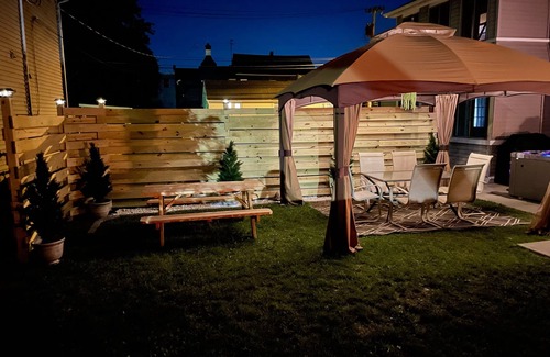 This wonderfully maintained 150 year old home offers updated living with original charm, from the completely redone bathrooms/ laundry room to the original hardwood floors. This one oversized master bedroom comes equipped with a queen sized bed, accompanying full size bed and private ensuite. Lets not forget its own entry to the patio just steps away from the seven person hot tub spa! You’ll enjoy barbecuing, taking shade under the gazebo, competitive rounds of billiards, and evenings near the fire pit in this 3/4 fenced in yard. If you’re looking for a small getaway, look no further. Book your stay today!