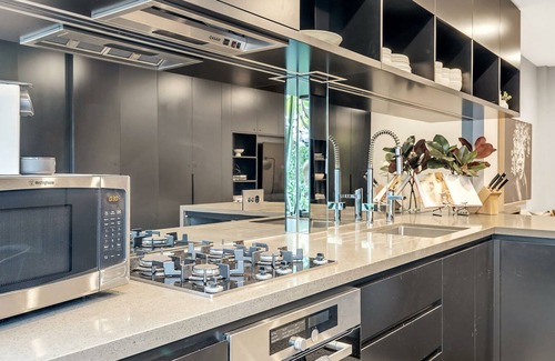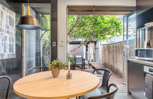 Edgy black walls and atmospheric polished concrete floors lead to the large open-plan living and dining area, where the industrial finish of this 2-storey home is softened by the natural views of your private sunny courtyard garden. Boasting two seating areas centred around a stunning frangipani tree, this is the perfect place to enjoy your morning coffee or a few sundowners on a warm afternoon after a long day of exploring!