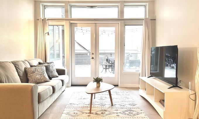 The living area is bright and airy, with large windows that let in plenty of natural light. Relax on the comfortable sofa and catch up on your favorite shows on the flat-screen TV, or enjoy a cup of coffee from the provided coffee maker for the comfort of your pre-work rituals or while planning your day's adventures.