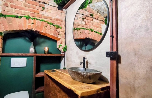 Wnętrze apartamentu zdobią autentyczne, odsłonięte ściany ze starej cegły, które nadają przestrzeni niezwykłego charakteru i wzmacniają poczucie tajemnicy. Surowy design uzupełniają metalowe elementy oraz starannie dobrane, stylowe akcenty.