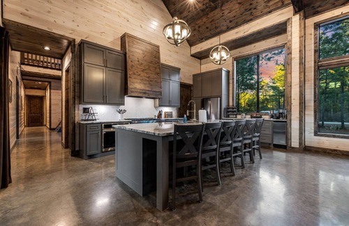 Beautiful stained concrete floors stretch out as far as the eye can see across the open-concept living room. The soaring ceilings, rustic beams, and incredible views, cultivate a sense of space and wonder from the moment you step inside. Relax on the cozy couches in front of the gas fireplace, enjoy your favorite shows on the smart TV, or simply soak in the awesome views.