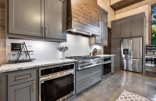 Inside, you'll find a soaring vaulted game room featuring a two-story indoor treehouse with a slide, foosball table, arcade games, and a hidden play space. Endless fun for kids and adults alike! The cabin also boasts a gourmet chef's kitchen, fully stocked for all your culinary needs, and a spacious family room with a stone fireplace for relaxing after a day of adventure.