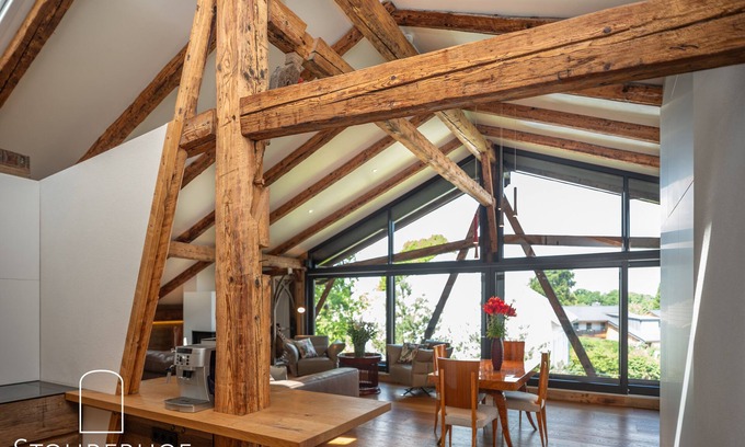 The completed in April 2019 luxury penthouse in the lavishly renovated, listed farmhouse in Riederau am Ammersee (17J 1770) with about 100 square meters of living space is the jewel for the guest with a sense for the special and well-known as founder farm and former museum Stohrerhof. The holiday home has just been added to the catalog "The best of the region". In this loft-like penthouse with two double beds, 1 fireplace, 1 kitchen, 2 bathrooms, shower with overhead shower, separate toilet, do not miss anything. Jetty, lido and of course the Ammersee are within walking distance 10 minutes from the farm. 3 restaurants are in the immediate vicinity in the village. Hiking and cycling trails start right outside the front door.