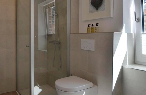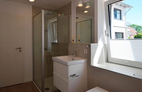 The second bathroom is equipped with a shower (RAINSHOWER), a toilet, a vanity unit with vanity unit, a mirror and a vanity mirror as well as an initial supply of cosmetics.