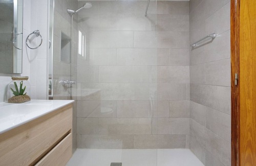 This vacation rental features private terraces, both open and covered, perfect for relaxing evenings. Additionally, guests have access to a shared outdoor area with a garden. There is a shared pool in the complex, but it is currently out of service due to renovations.
